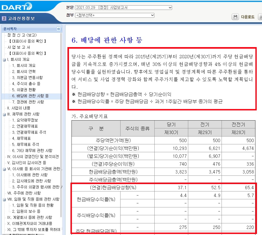 고려신용평가 기업 발굴 비기는 바로, 배당금순으로 기업을 나열한 후 전부 하나씩 다 살펴보는 것입니다.