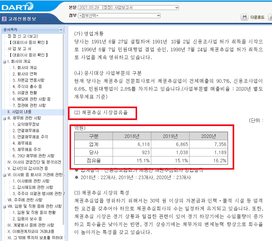 회사의 이름에 '신용정보'가 들어가지만 채권추심업에서 나오는 수익이 대부분을 차지합니다.