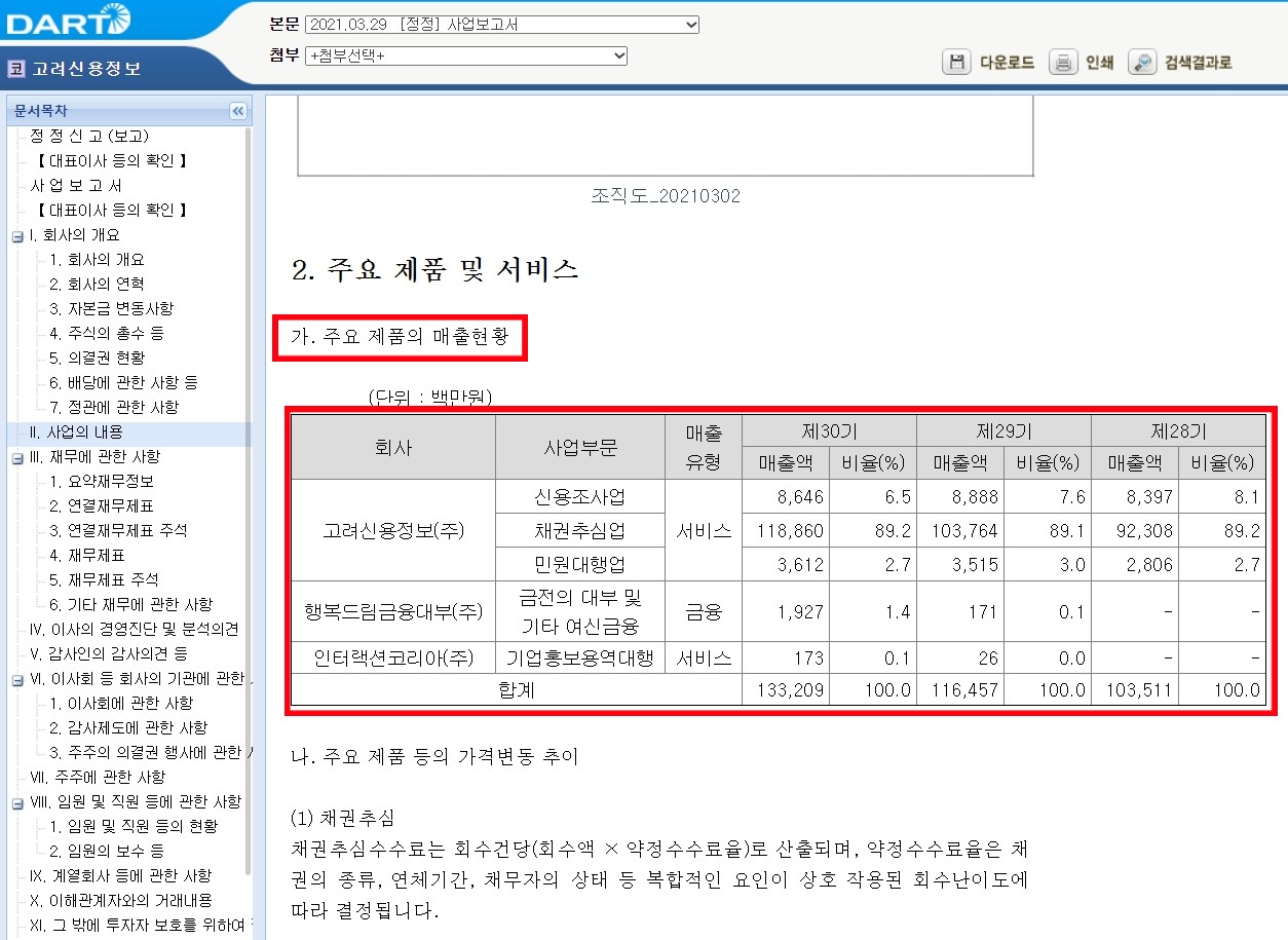 고려신용정보 주요제품 매출정보