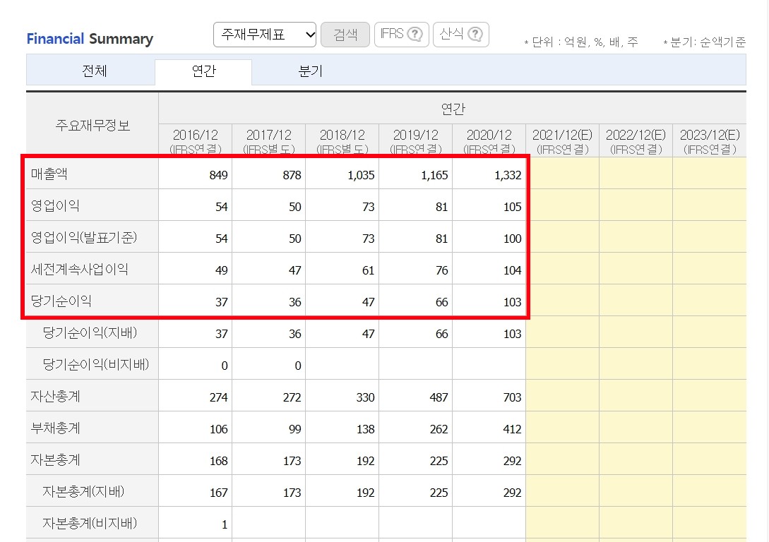 지난 5년간 매출액 지속 상승, 영업이익과 당기순이익은 추세적 상승을 보여주고 있습니다.