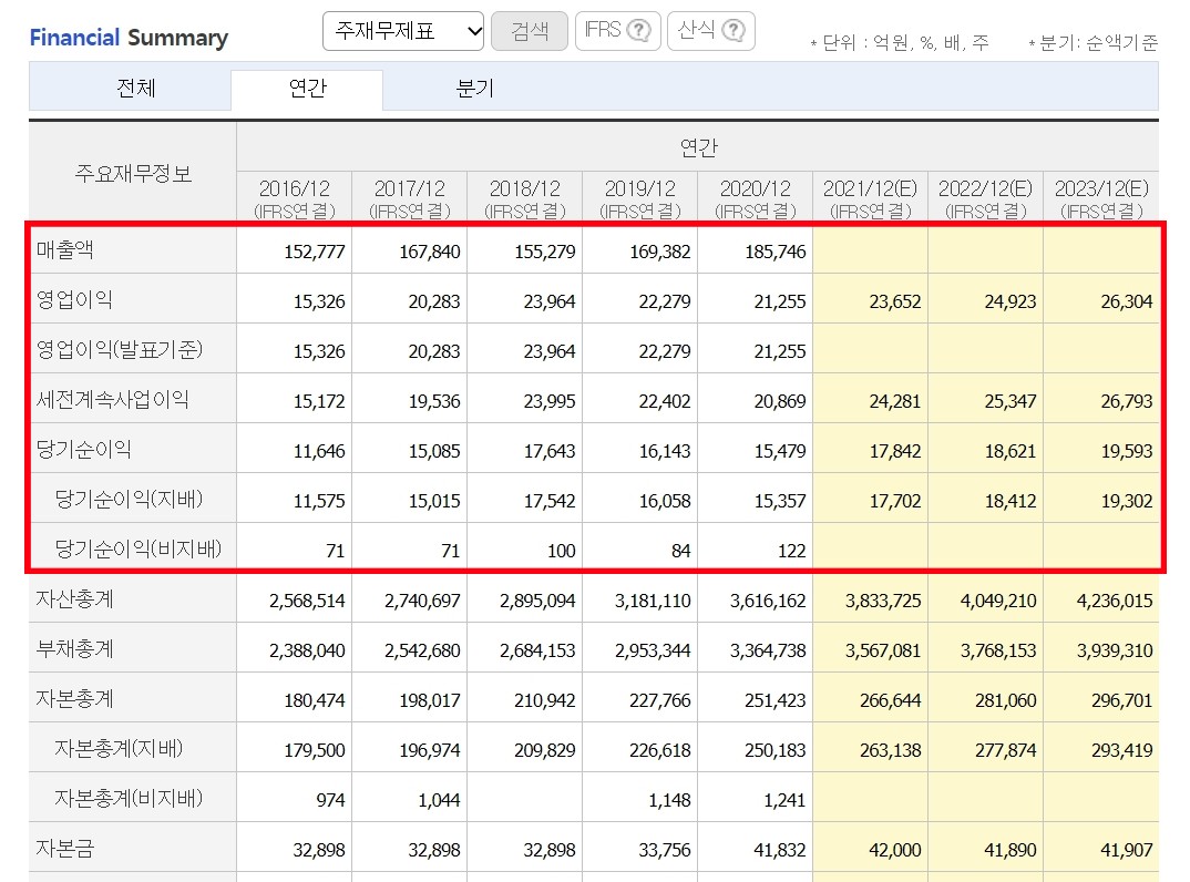 지난 5년간 매출액/영업이익을 보면 장기적 우상향 하는 것은 맞지만 매년의 이익 규모를 예상하기 조금 어렵습니다.