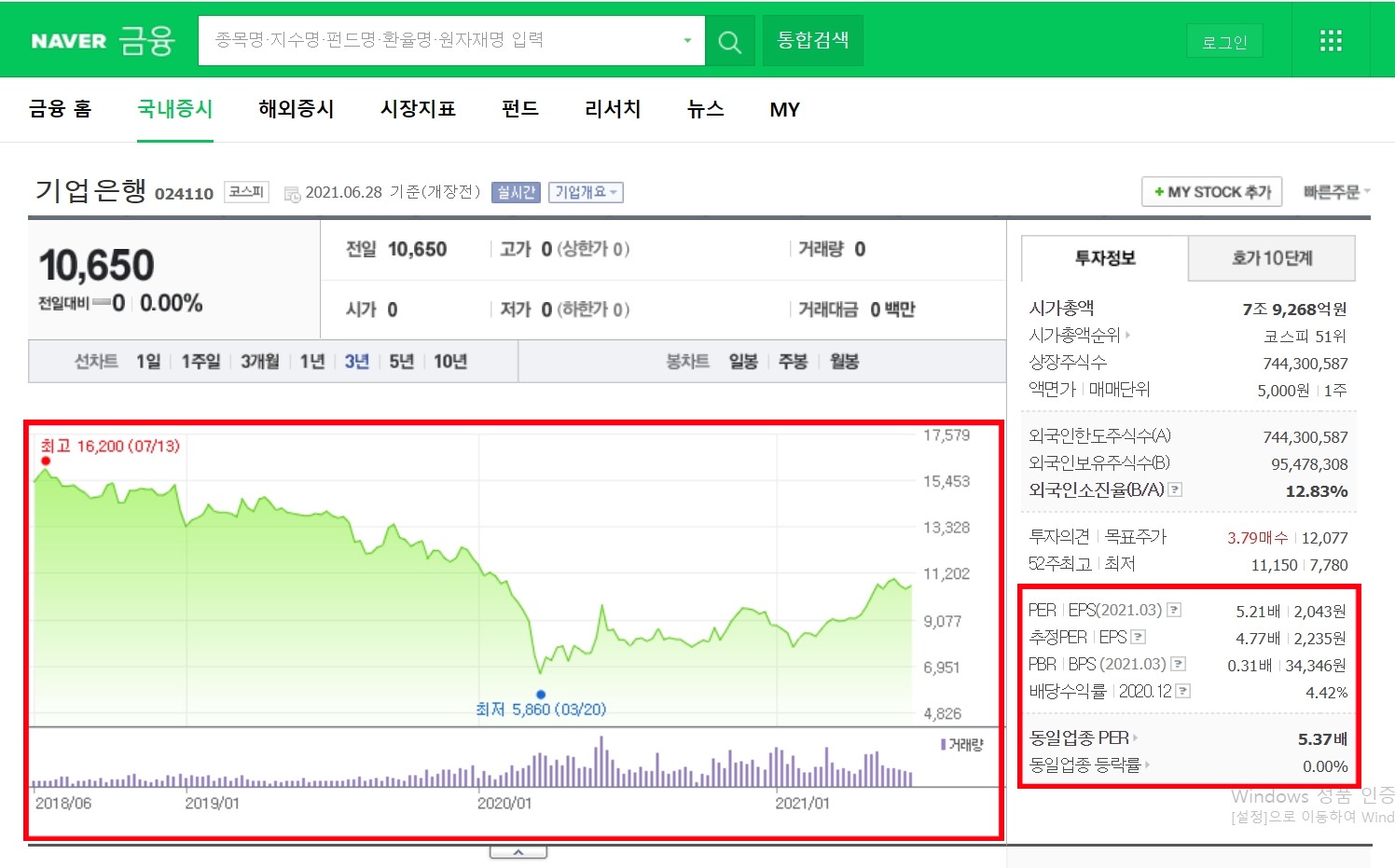 기업은행의 주가는 코로나19 이후 금융장세에서도 그렇게 많이 오르지 못했어요.