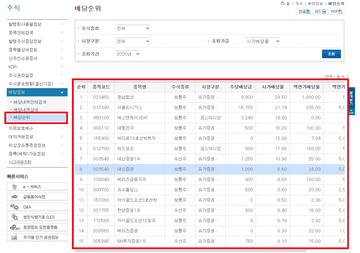 배당순위별 기업리스트는 [세이브로]를 확인해주세요.
