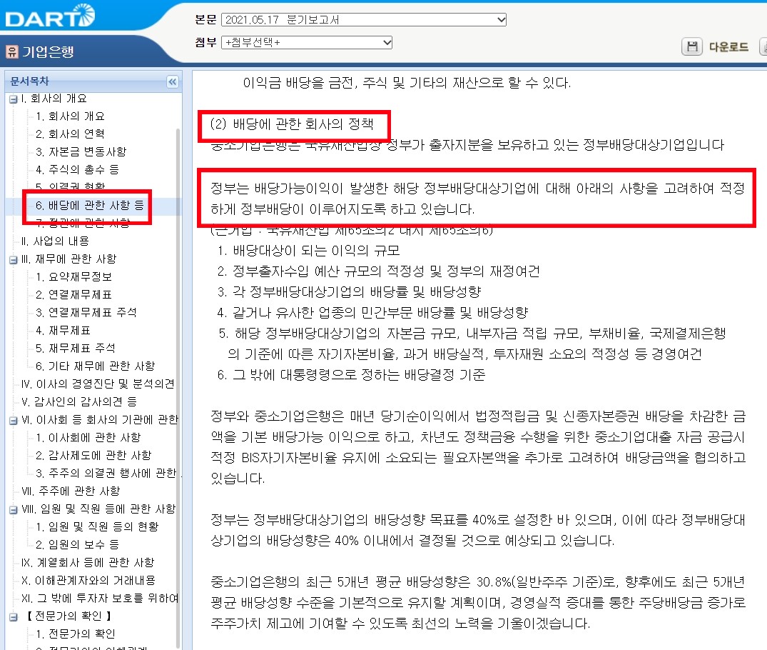 정부는 중장기적 정부배당기업의 배당성향을 40%로 목표, 중소기업은행은 5년간 배당성향 30.8%로 주주가치 실현에도 최선을 다하고 있다고 합니다.