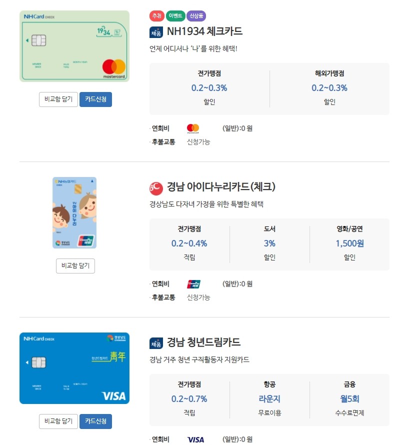 농협카드 중 체크카드만 따로 보고 싶으시면, 상단 [검색/비교]탭에서 [조건별검색] 이용하시면 될 것 같아요
