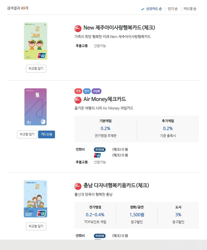 21년 6월 현재, NH농협체크카드 검색결과 49개.