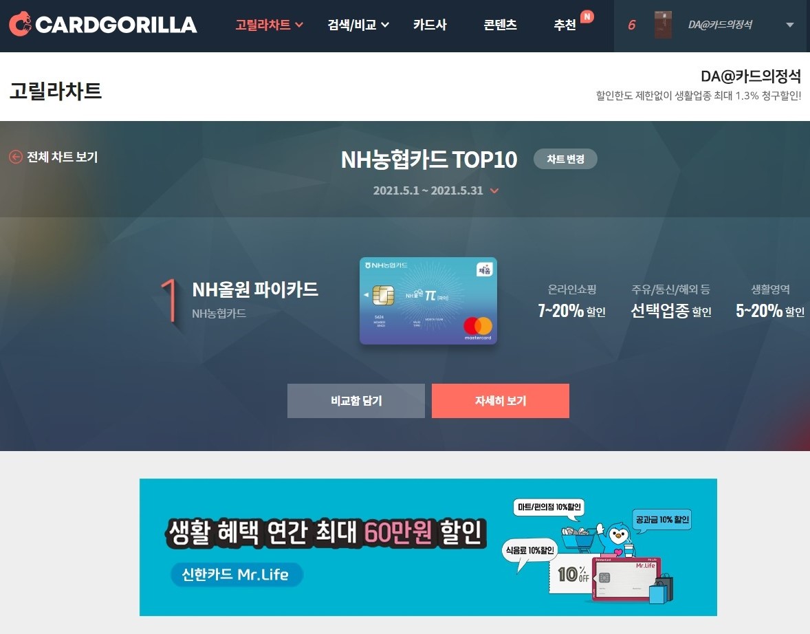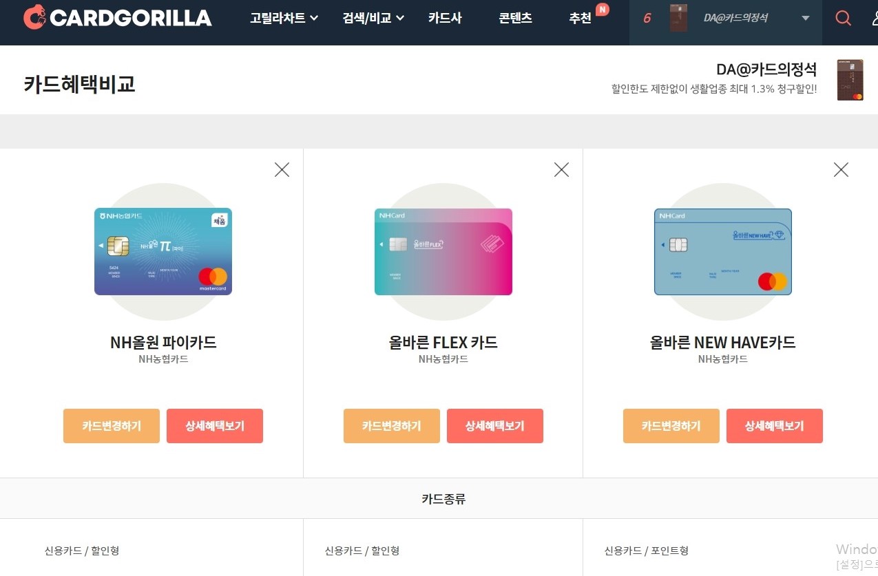카드고릴라에서 검색된 NH농협카드 베스트 FIVE 소개해드립니다.