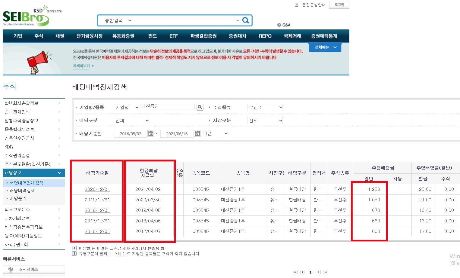 대신증권 우선주의 배당기준일은 12월 31일로 되어 있고 현금배당 지급일은 조금씩 다르지만 보통 3월 말에서 4월 초에 지급되고 있습니다. (배당락일은 다음 그림을 확인해주세요)