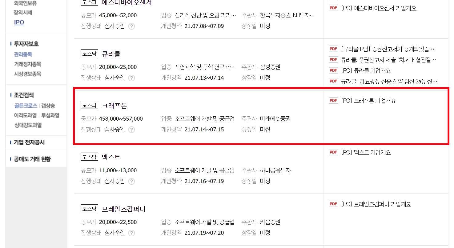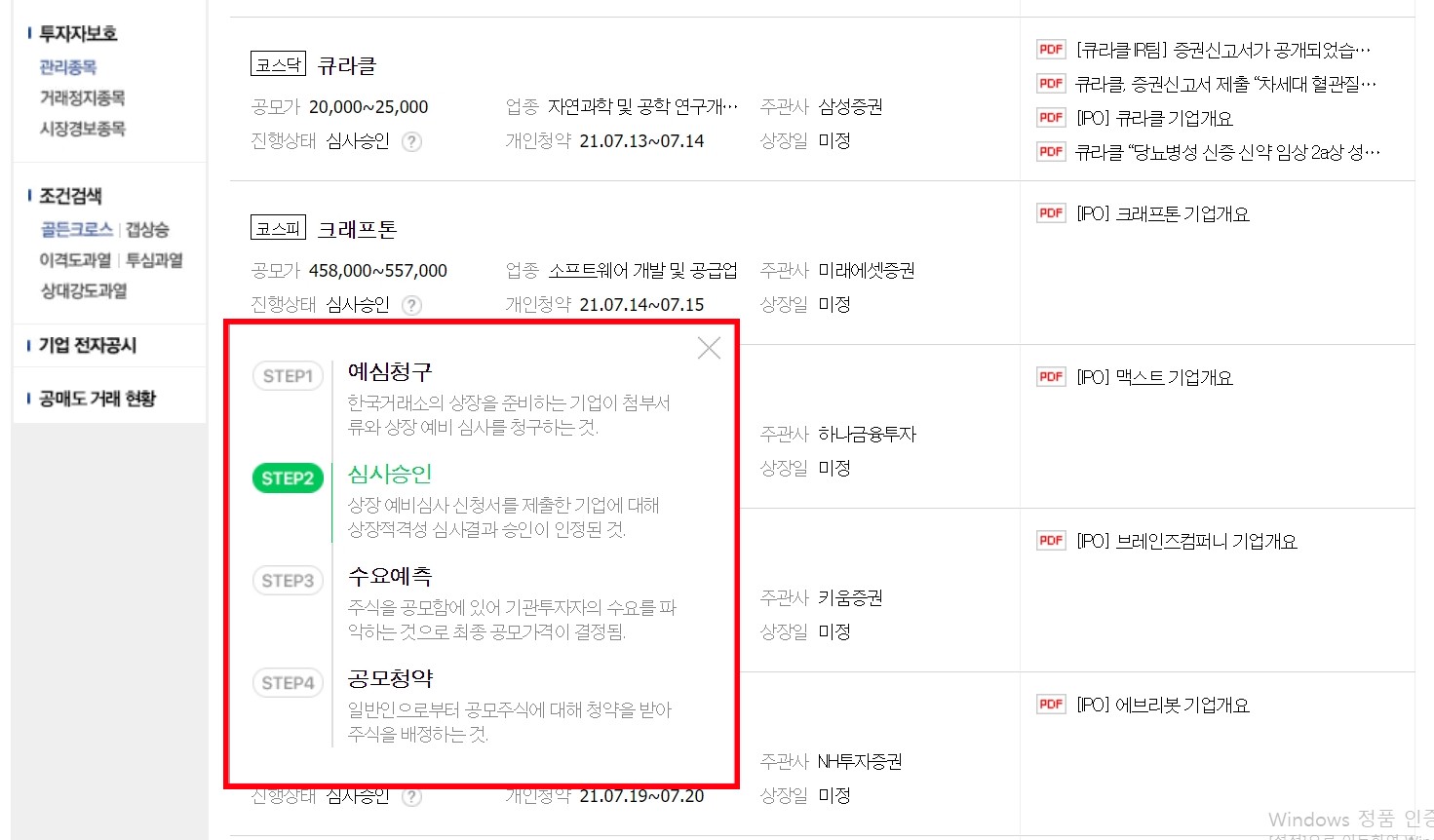 | 공모청약 | 일반인에게 공모주 청약 진행 |